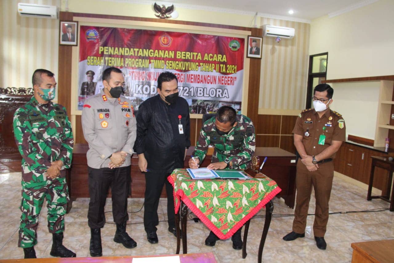NASIONALXPOS.CO.ID, BLORA – Dihadiri Bupati Blora, H Arief Rohman, dan Kapolres Blora AKBP Wiraga Dimas Tama, SIK, TNI Manunggal Membangun Desa (TMMD) Sengkuyung Tahap II TA 2021 resmi dibuka ditandai dengan penandatanganan, dan penyerahan naskah serah terima berita acara, bertempat di gedung Samin Setda Blora, Selasa (15/6/2021).