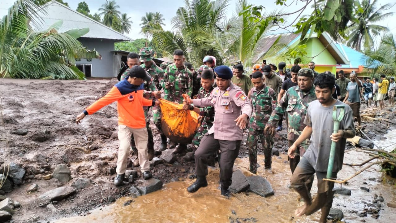 Gabungan Personil Brimob bersama TNI/Polri dan Tim Sar dalam melakukan pencarian korban banjir bandang yang tertimbun reruntuhan bangunan rumah dan lumpur hingga sore hari, tercatat 14 korban ditemukan meningal dunia sementara 5 lainnya mengalami luka berat dan luka ringan telah di evakuasi ke RSUD Ternate.