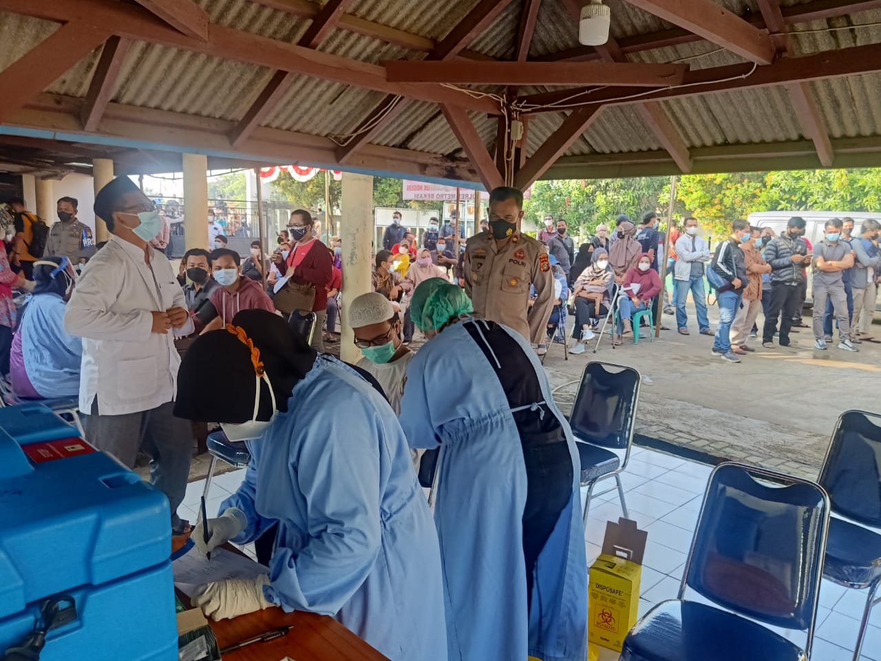 Bertempat di kantor desa cilangkara kecamatan serang baru kebupaten bekasi, ratusan warga dengan menggunakan protokol kesehatan di minta untuk mengantri melakukan vaksinasi yang di lakukan petugas kepolisian polsek serang baru.