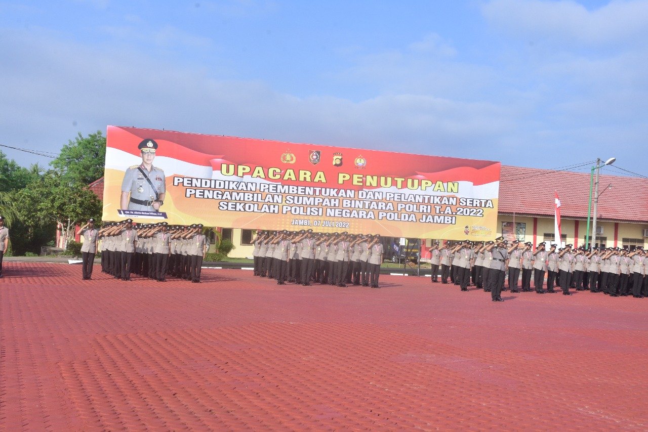 JAMBI, NASIONALXPOS.CO.ID – Kapolda Jambi, Irjen Pol. A. Rachmad Wibowo pimpin upacara penutupan pendidikan pembentukan (Diktuba) dan pelantikan serta pengambilan sumpah Bintara Polri T.A 2022 pada Kamis, (07/07).