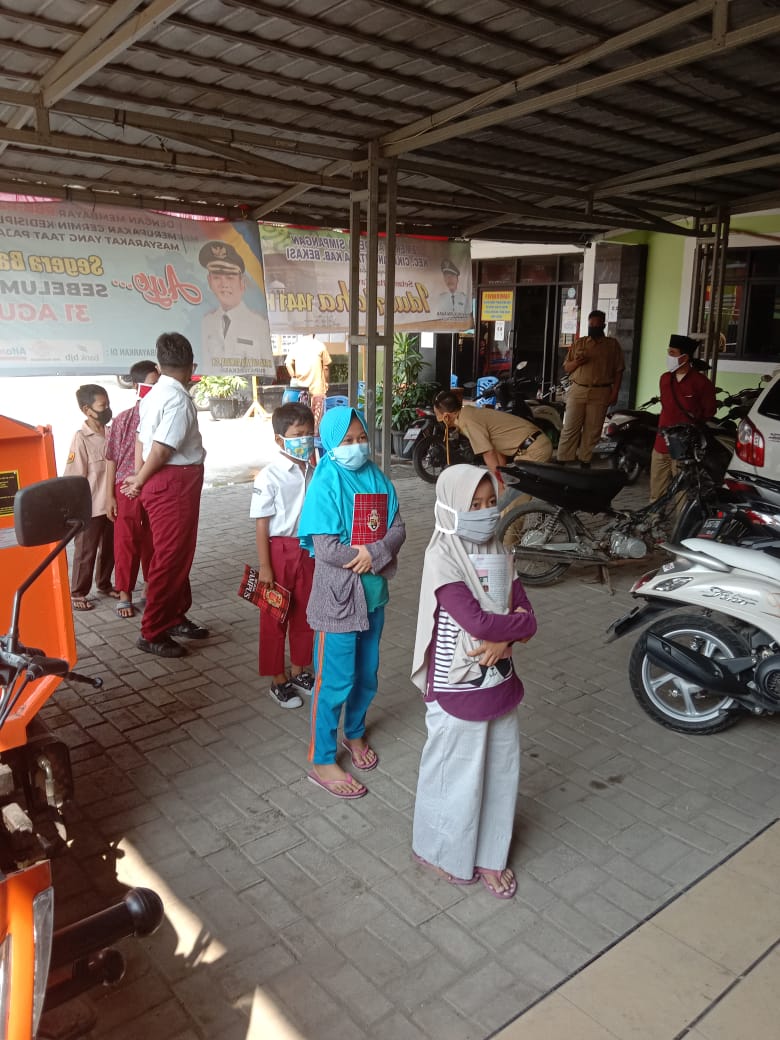 Para siswa-siswi yang datang ke aula desa untuk belajar dengan koneksi wifi gratis wajib menerapkan protokol kesehatan seperti jaga jarak, mencuci tangan sebelum memasuki ruangan, dan menggunakan masker.