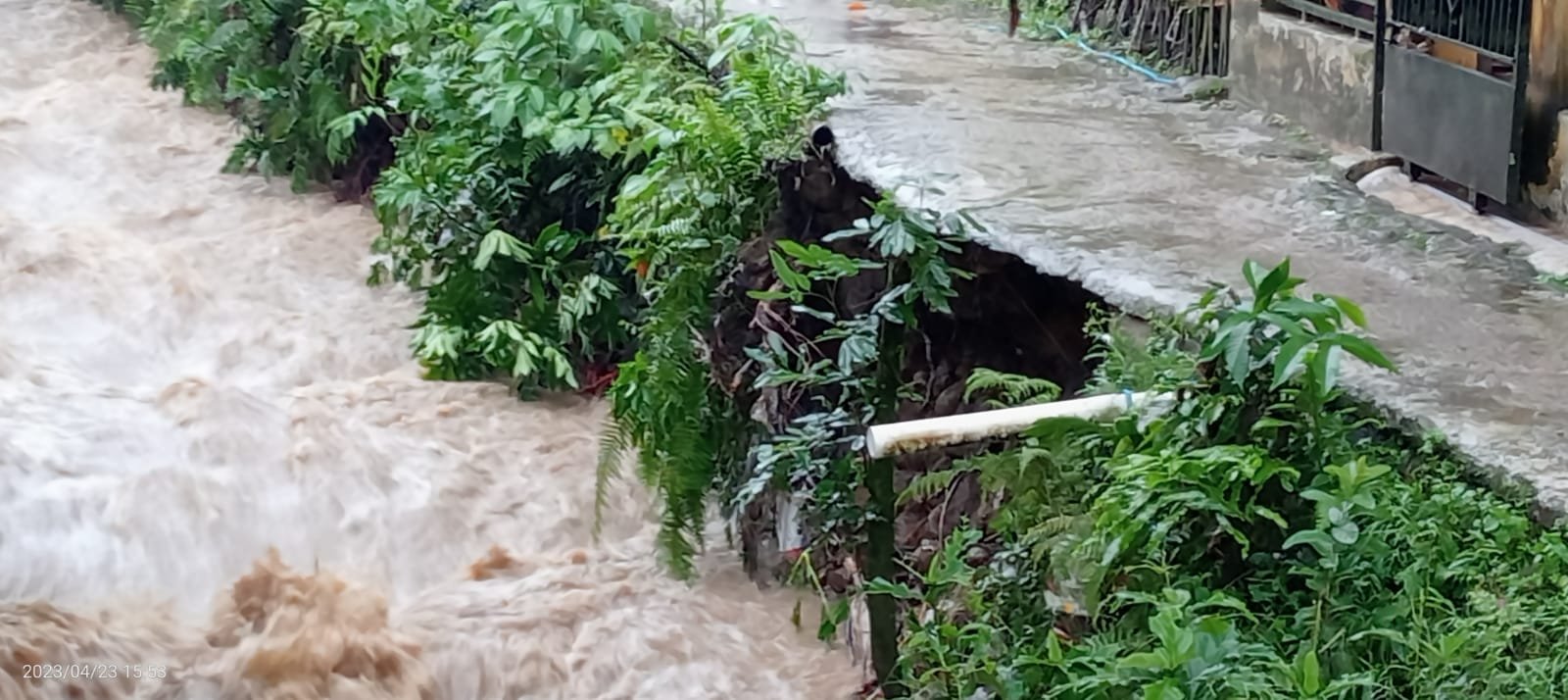 Intensitas hujan cukup tinggi mengakibatkan sungai Cikuning Meluap dan satu rumah milik warga kp. Cikuning Desa Sukamaju kecamatan Sobang yang ada di bantaran sungai amblas. amblasnya tanah tersebut di duga tidak ada tembok penyanggah tanah(TPT) di sungai tersebut.