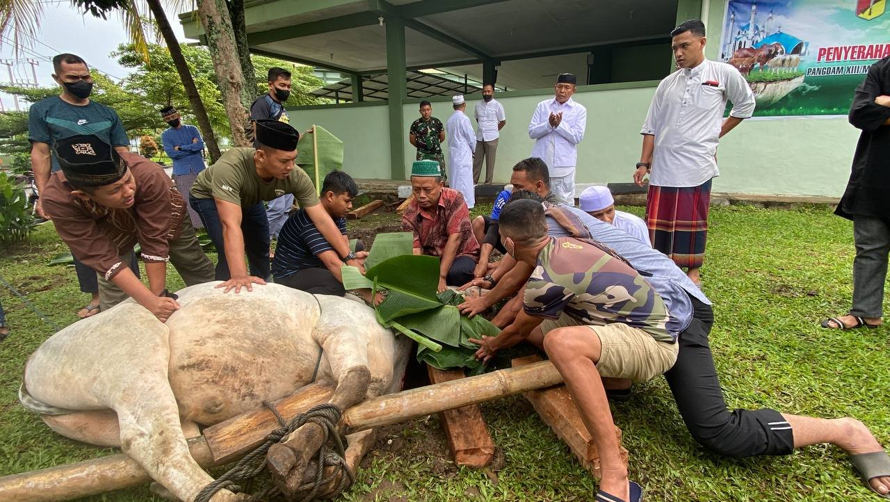 Usai sholat Idul Adha, dilanjutkan dengan penyerahan hewan kurban 2 ekor sapi dari Pangdam XIII/Merdeka Mayjen TNI Denny Tuejeh yang diserahkan oleh Irdam XIII/Merdeka Brigjen TNI Denny Masengi kepada panitia kurban, Katuud Bintaldam XIII/Merdeka Kapten Inf Rekom Mulyadi dan 1 ekor sapi dari Gubernur Sulut Olly Dondokambey SE, yang diserahkan , Biro Kesra Setda Pemprov Silvia Tarandung SE, serta 2 ekor Kambing dari Waaster Kasdam XIII/Medeka dan Minvedcaddam XIII/Merdeka sehingga kurban yang di terima panitia sebanyak 3 ekor sapi dan 2 ekor kambing.