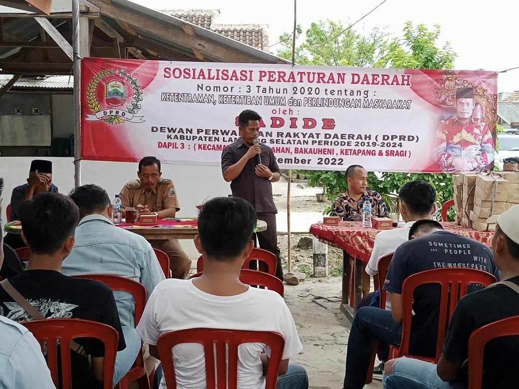 NASIONALXPOS.CO.ID, LAMPUNG SELATAN – Anggota Dewan Perwakilan Rakyat Daerah( DPRD) Lampung Selatan Sadide Sosialisasi Peraturan Daerah (SOSPER)Nomor3 Tahun 2020 Tentang Ketentraman, Ketertiban Umum Dan Perlindungan Masyarakat Senin 19/09/2022