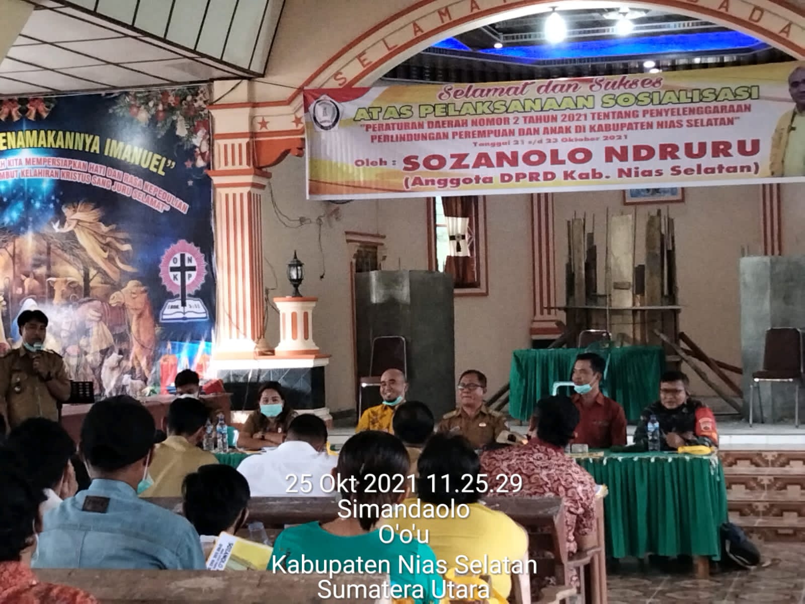 NASIONALXPOS.CO.ID, NIAS SELATAN – Dalam rangka melanjutkan sosialisasi Peraturan Daerah Kabupaten Nias Selatan nomor 2 tahun 2021, tentang Perlindungan Perempuan dan Anak dari tindak kekerasan yang dilaksanakan pada hari senin (25/10/2021), bertempat di Gedung Gereja ONKP di Desa Hilinamazihono, Kecamatan O’o’u, Kabupaten Nias Selatan Provinsi Sumatera Utara.