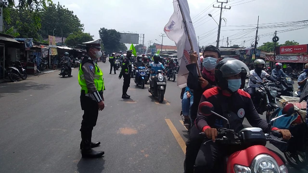 Anggota Satlantas Polres Serang Lakukan Pengaturan Lalu Lintas Kendaraan yang Dilalui Massa Unras Buruh