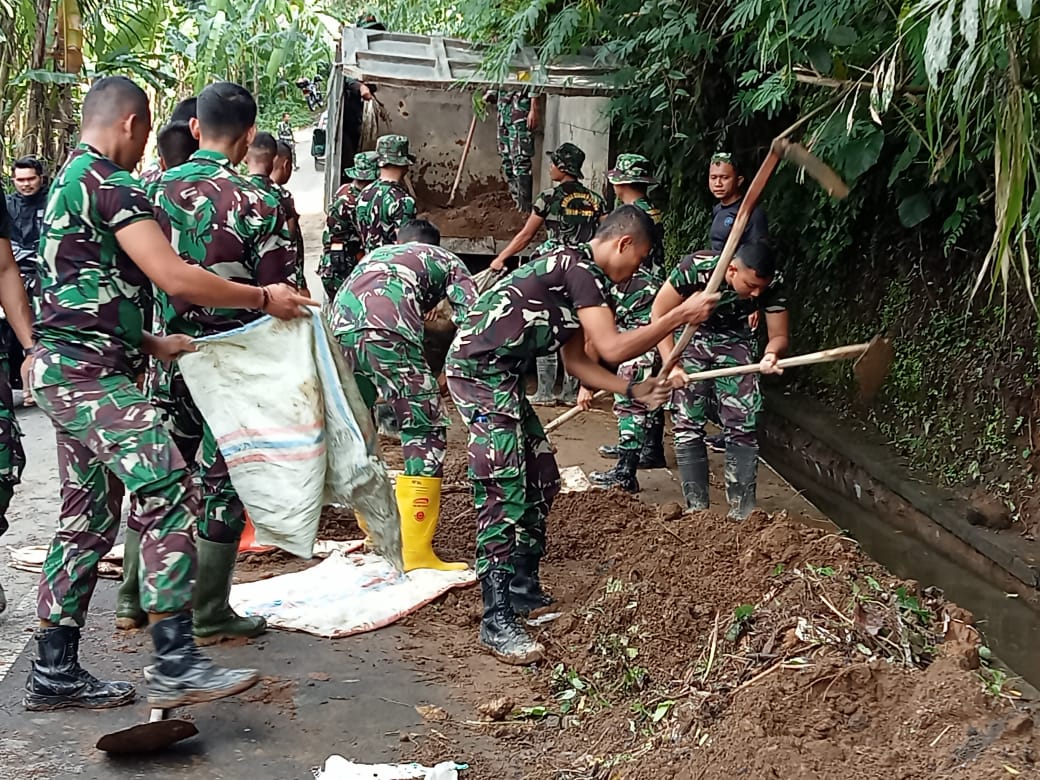NASIONALXPOS.CO.ID, GIANYAR – Pembersihan material tanah longsor di wilayah Desa Buahan yang berada di sekitaran badan jalan Desa, dengan maksud memberi rasa aman bagi masyarakat, Babinsa Koramil 1616-07/Payangan, Pelda. I Ketut Sura turun langsung melaksanakan karya bakti membersihkan material tanah longsor bersama Yonzipur 18/ YKR, yang dipimpin oleh Pasi Intel, Lettu. Czi Aril Dian Prastyo, Senin, (24/10/2022).