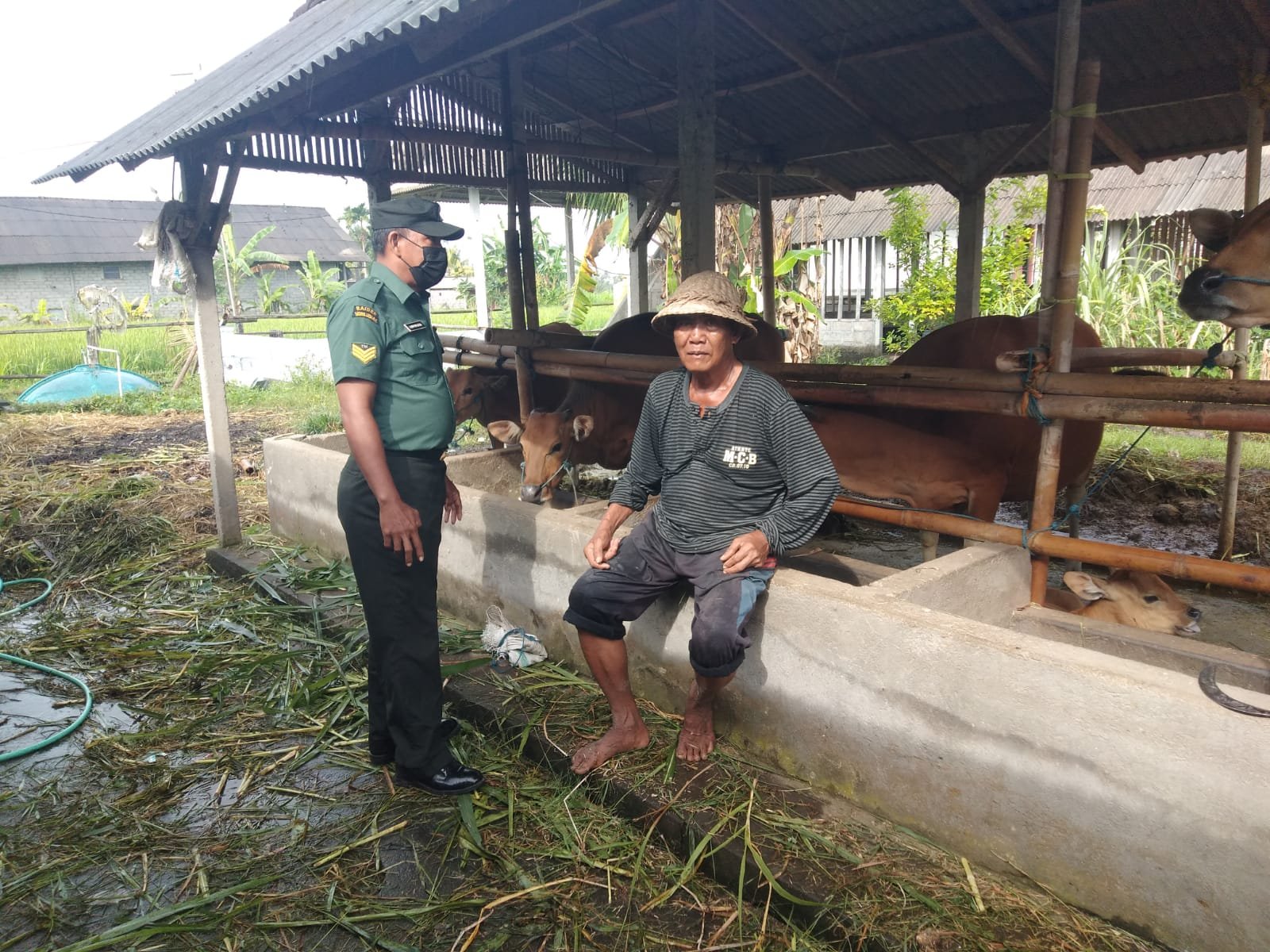 Babinsa Kodim 1616/Gianyar, Koramil 04/Blahbatuh, Desa Belega, Serka I Nyoman Mulatra, menghimbau kepada peternak agar selalu menjaga kebersihan lingkungan sekitar kandang sehingga dapat terhindar dari PMK dan juga diingatkan agar melaksanakan vaksinasin pada ternak sapi untuk mencegah PMK.