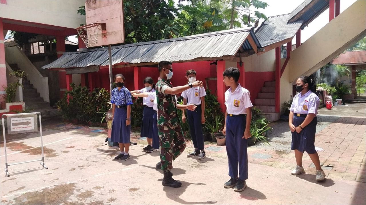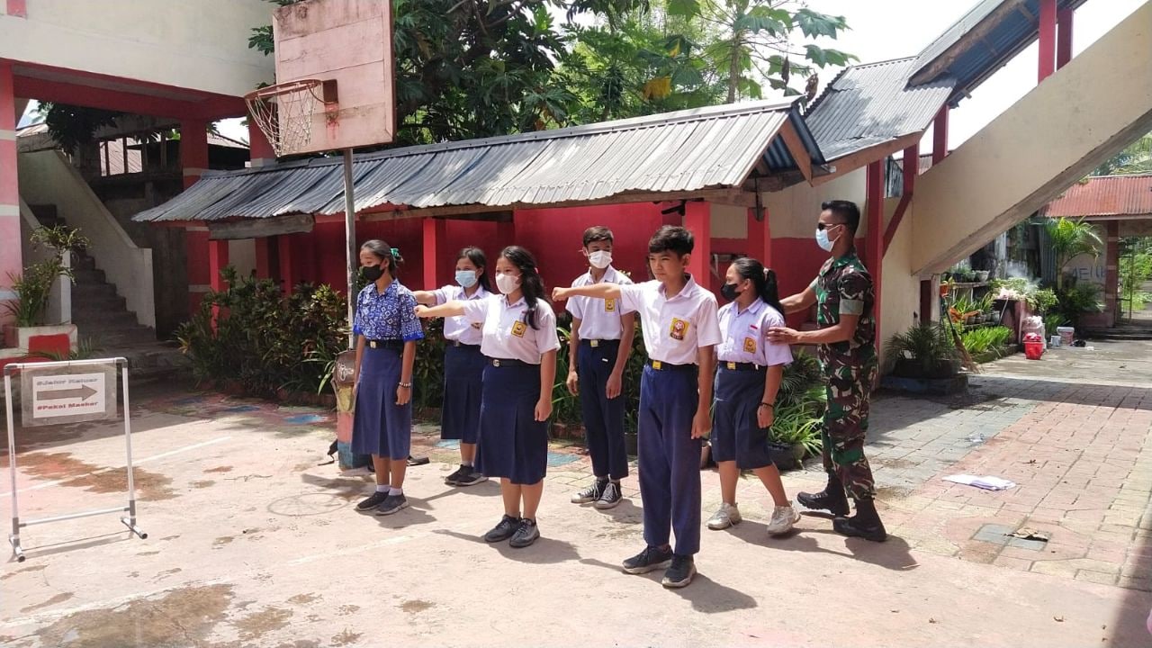 Bintara Pembina Desa Koramil 1302-13/Tombatu Serda Samiaji menyambangi Sekolah SMP Negeri-1 yang berada di Desa Lobu, Kecamatan Touluaan, Kabupaten Mitra pada Jum’at 27/05/2022 pukul 09.20 wita.