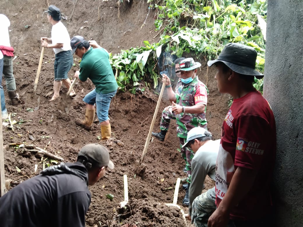 Dengan mengajak warga sekitar kejadian untuk ikut serta melaksanakan pembersihan tana longsoran yang nyaris menutupi seluruh bangunan dapurwarga,