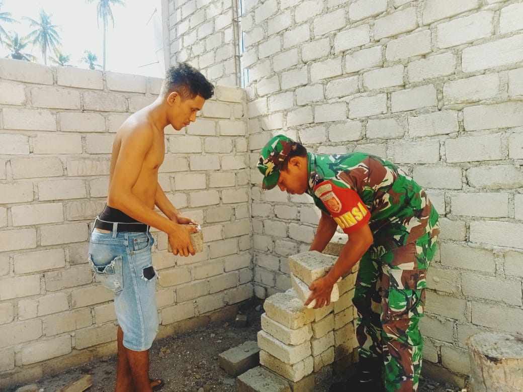 NASIONALXPOS.CO.ID,HALTENG – Babinsa Koramil 1512-01/Weda, Makodim 1512/Weda Serda Hasan Tawainela, melaksanakan Karya Bhakti membantu pekerjaan pembangunan rumah milik Ismail warga Desa Kotalo Kecamatan Weda Timur, Kabupaten Halmahera Tengah (Halteng) Kamis (30/03/2023).