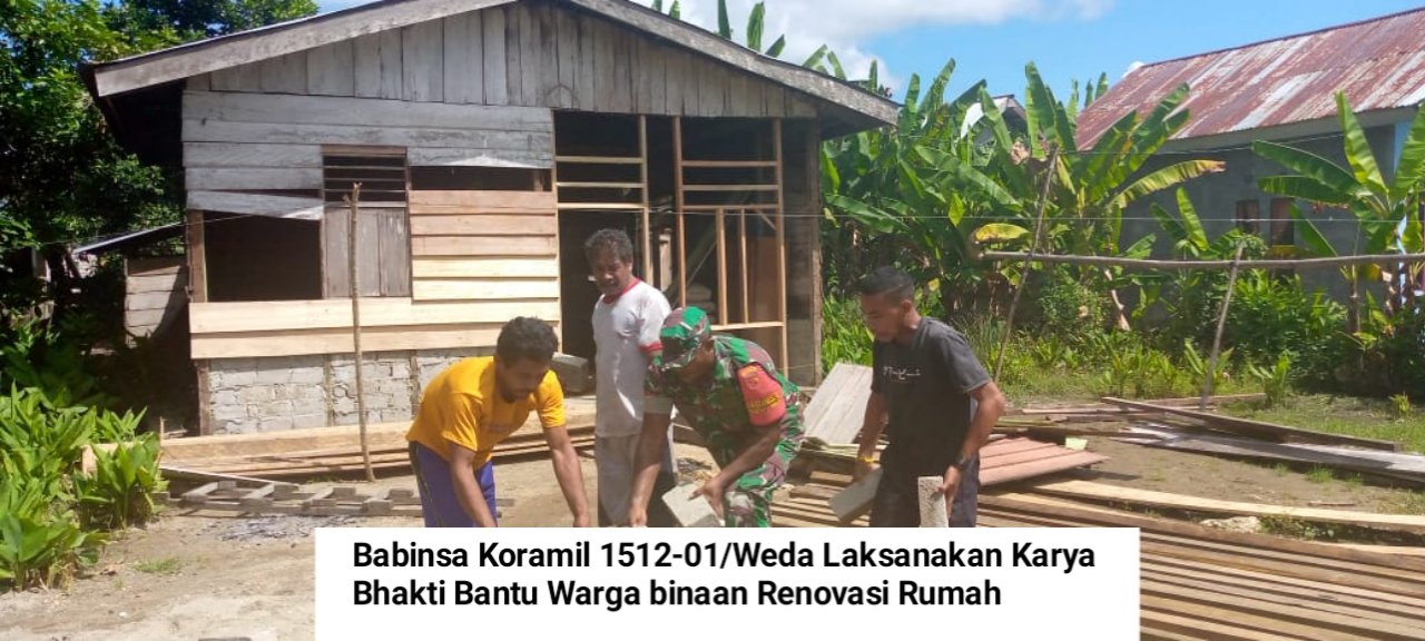 NASIONALXPOS.CO.ID,HALTENG – Dalam rangka meningkatkan rasa kepedulian TNI terhadap Masyarakat di Wilayah Binaan, Babinsa Korami 1512-01/Weda Kopda Samuel Kolohuwey melaksanakan Karya Bhakti merenovasi rumah milik Bapak Yafet Rantua, warga Desa Sosowomo, Kecamatan Weda Selatan, Kabupaten Halmahera Tengah (Halteng) Maluku Utara Minggu (07/05/2023).