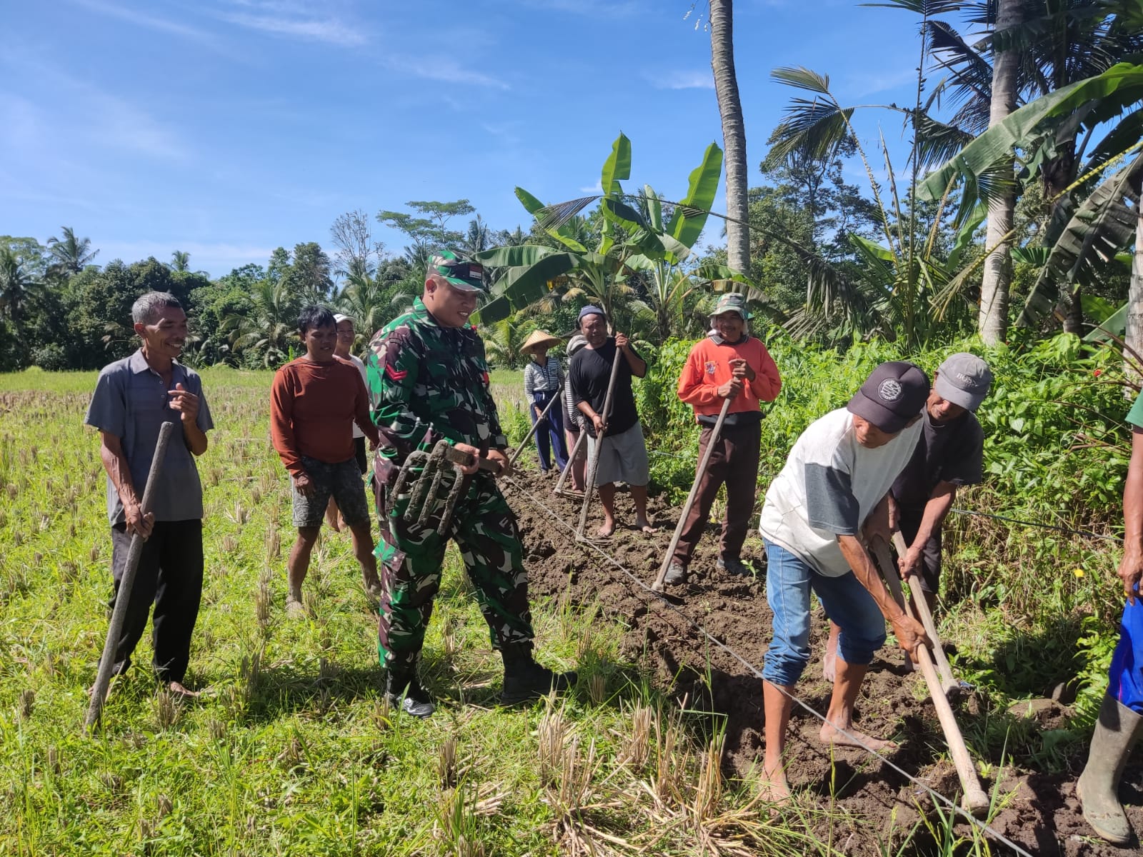 Babinsa Sumita Village, Koramil 1616-01/Gianyar, Koptu. I Made Juliarta synergizes with Bhabinkamtibmas and Pecalang Sumita Traditional Village, carrying out the Work Devotion to making footpaths in the subak bungkah area of Sumita Village, Gianyar District. Monday, (23/01/2023).