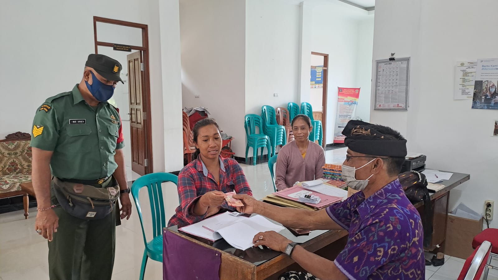 Babinsa Koramil 1616-06/Tegallalang mendampangi dan melaksanakan pengamanan terhadap penerima BLT DD yang dibagikan oleh Kasi Kesejahteraan Desa Kenderan, I Made Berata.