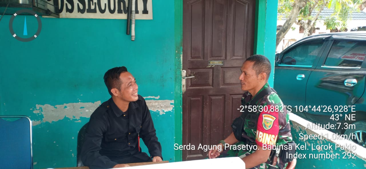 NASIONALXPOS.CO.ID, PALEMBANG – Babinsa Kelurahan Lorok Pakjo Koramil 418-02/Pakjo Sertu Agung Prasetyo, melaksanakan Komsos dengan Security Rumah Sakit Mama bapak Ari, Sabtu (1/4/2023).