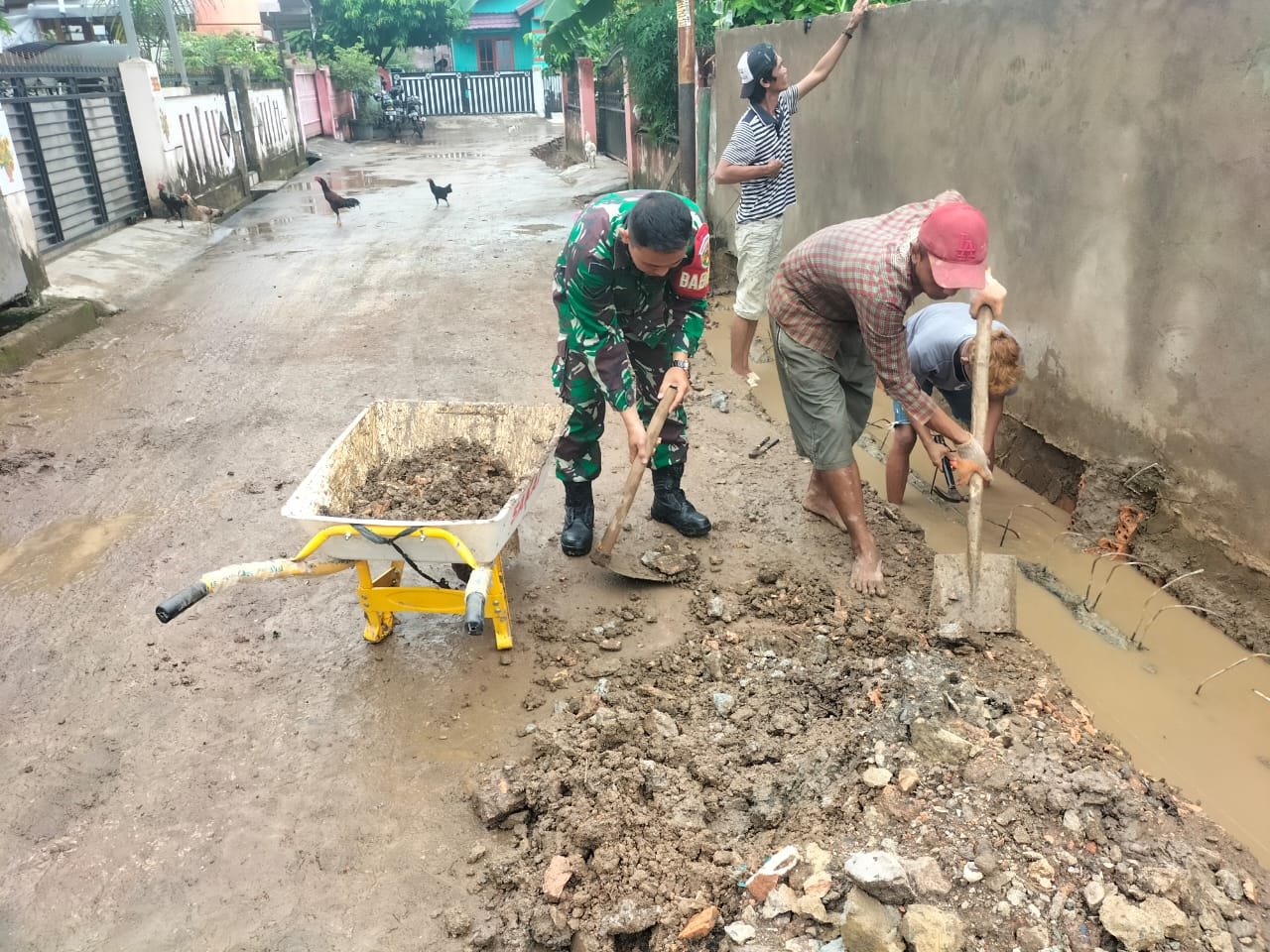 “Saluran pembuangan air yang kita perbaiki ini kurang layak dikarenakan paritnya terlalu kecil,sehingga mengakibatkan seringnya terjadi genangan air pada saat hujan,” kata Serda Sofiyan.