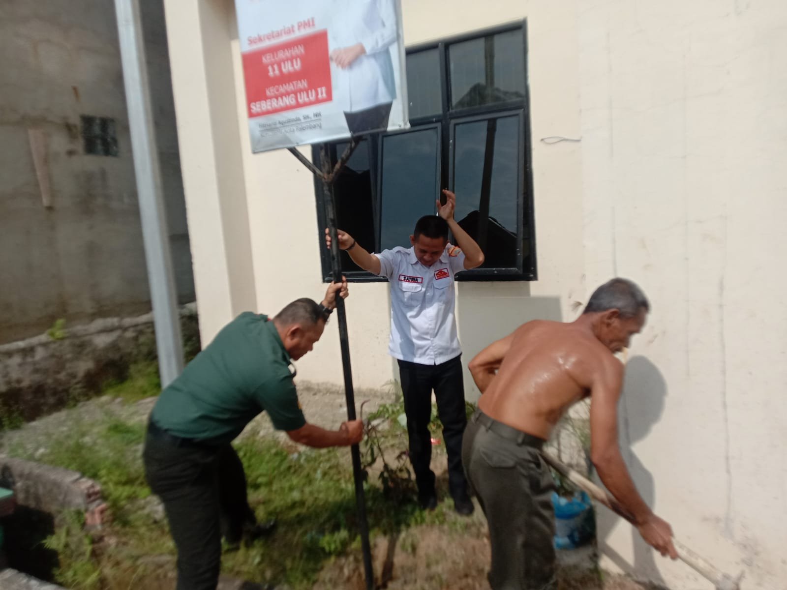 NASIONALXPOS.CO.ID, PALEMBANG – Babinsa Kelurahan 11 Ulu Koramil 418-03/Plaju Serka M. Armen, membantu Kasi Pemerintahan Kelurahan 11 Ulu Bapak Arianto mendirikan plang banner PMI, Senin (29/5/2023).