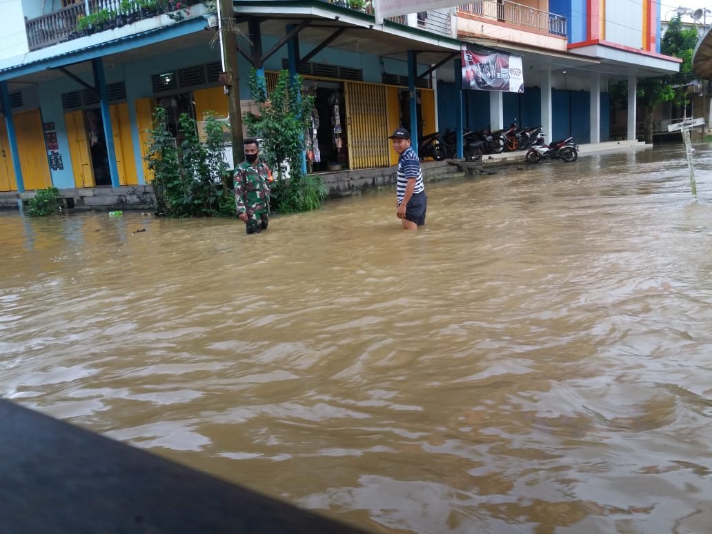 NASIONALXPOS.CO.ID, MELAWI (KALBAR) – Babinsa Koramil 04/Tanah Pinoh melakukan patroli dan monitoring banjir dari luapan Sungai Pinoh dan Sungai China di 2 Desa, Desa Suka Maju dan Desa Tanjung Gunung, Kecamatan Tanah Pinoh, Kabupaten Melawi pada Jumat pagi (18/06/2021).