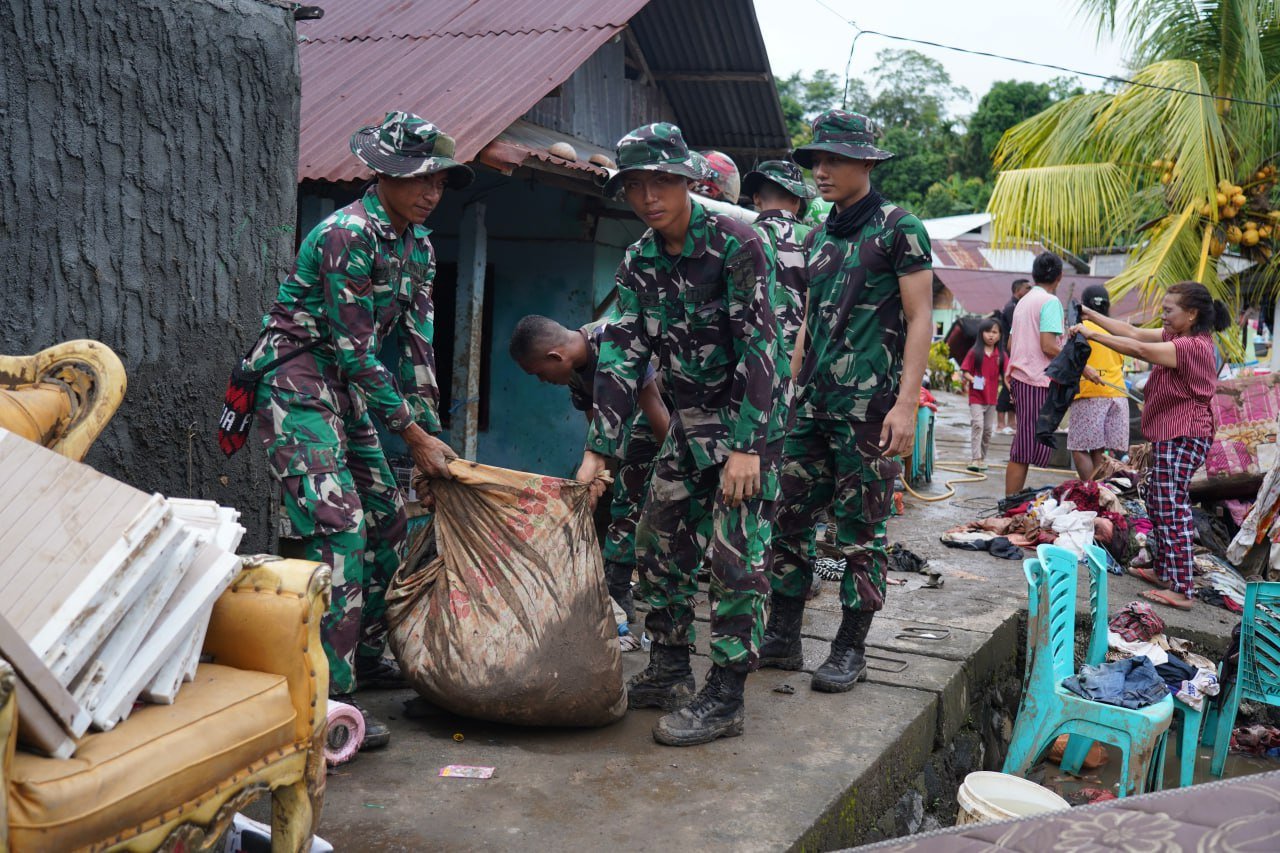 Kegiatan kerja bakti yang dilaksanakan oleh satuan Yonif Raider 712/Wiratama, Yonzipur 19/YKN serta satuan Teritorial yaitu Kodim 1309/Manado beserta Polri Polda Sulut kurang lebih 300 orang diturunkan untuk membantu dan meringankan beban masyarakat yang terkena dampak pasca bencana banjir yang melanda beberapa hari yang lalu.