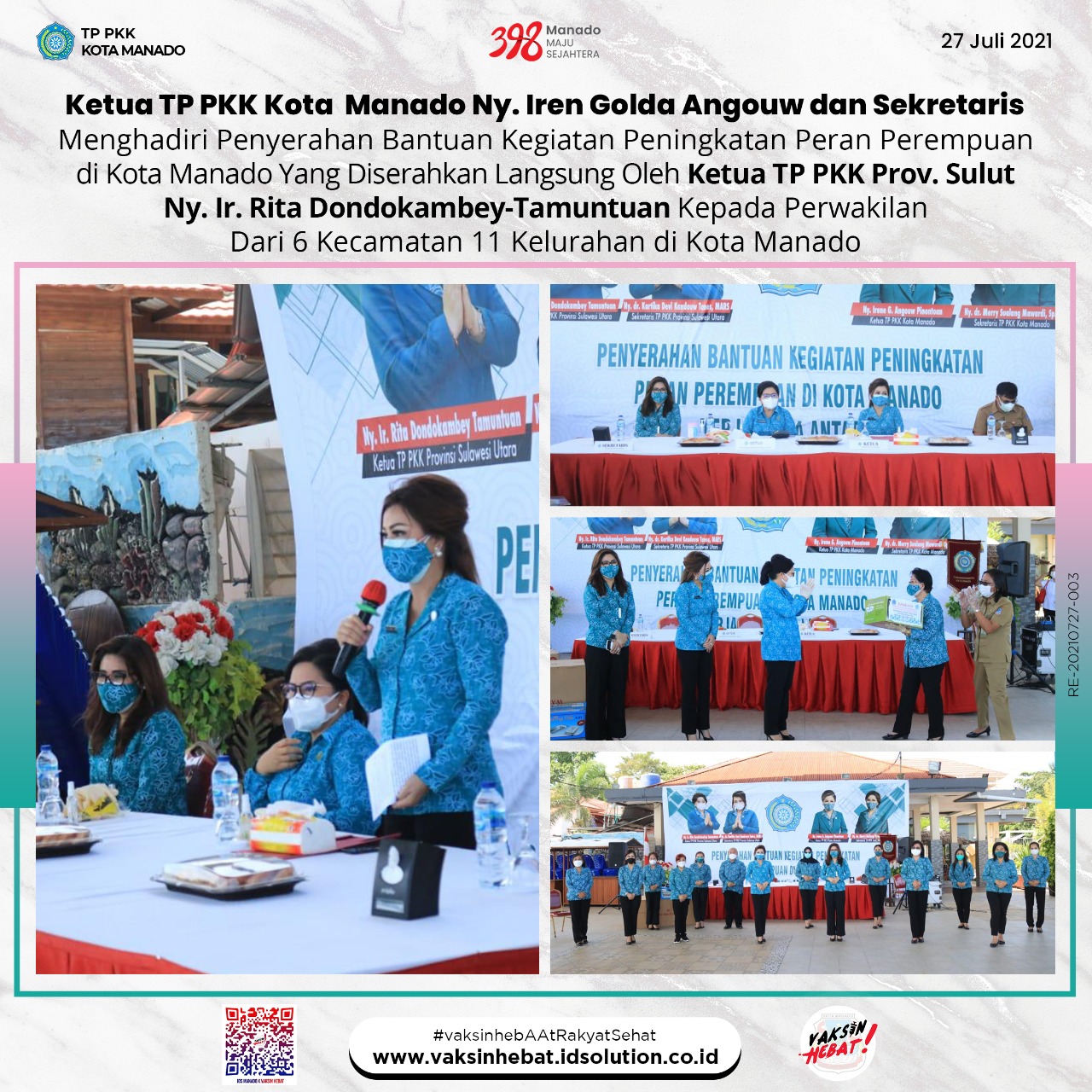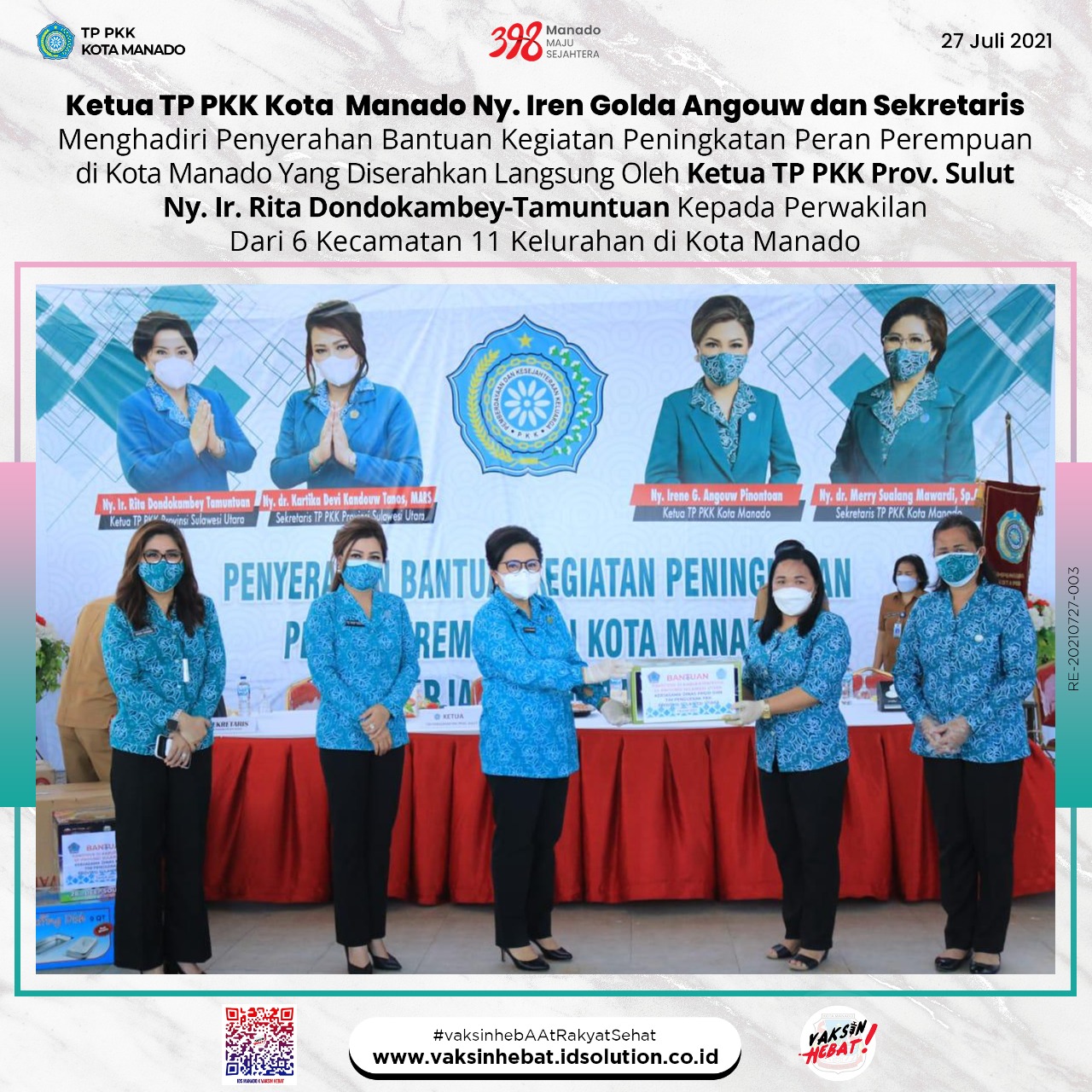 NASIONAL XPOS.CO.ID MANADO| Ketua TP – PKK Kota Ketua TP – PKK Sulut Ny. Ir. Rita Dondokambey – Tamuntuan bersama Kadis PMDD Sulut  didampingi Iren Golda Angouw – Pinontoan serta Sekretaris dr. Merry Sualang – Mawardi menyerahkan secara langsung bantuan kepada Perwakilan Dari 11 Kecamatan dan 6 Kelurahan yang ada di Kota Manado,Selasa(27/7/2021).
