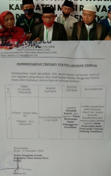 Dikatakan ia, saat rapat pleno bersama KPUD hari ini Senin 14 September 2020, berdasarkan hasil penelitian dan pemeriksaan terhadap temuan dan laporan yang masuk dan hasil kajian Bawaslu laporan dinyatakan tidak memenuhi unsur pelanggaran pemilu.