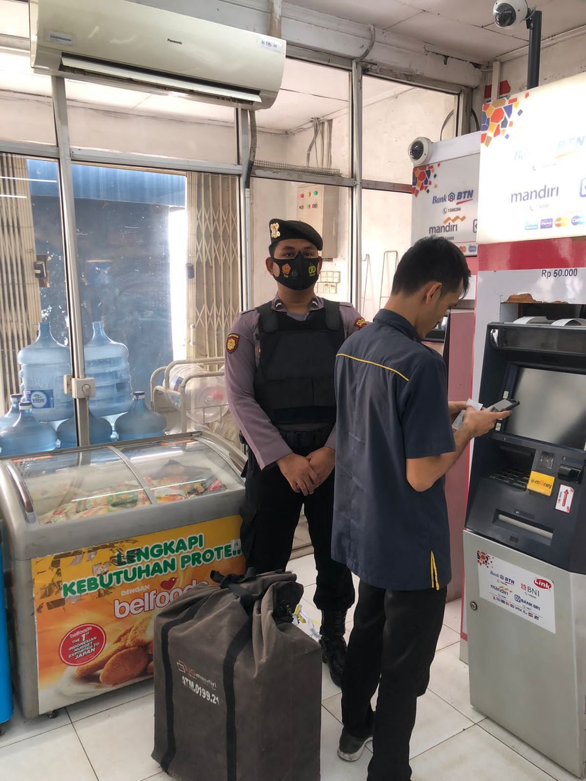 Bripda Dede Firmansyah dan Bripka Firman Personel Sat Samapta Polres Serang Polda Banten memberikan pengawalan kepada petugas pengisian ATM dari PT UG MANDIRI.