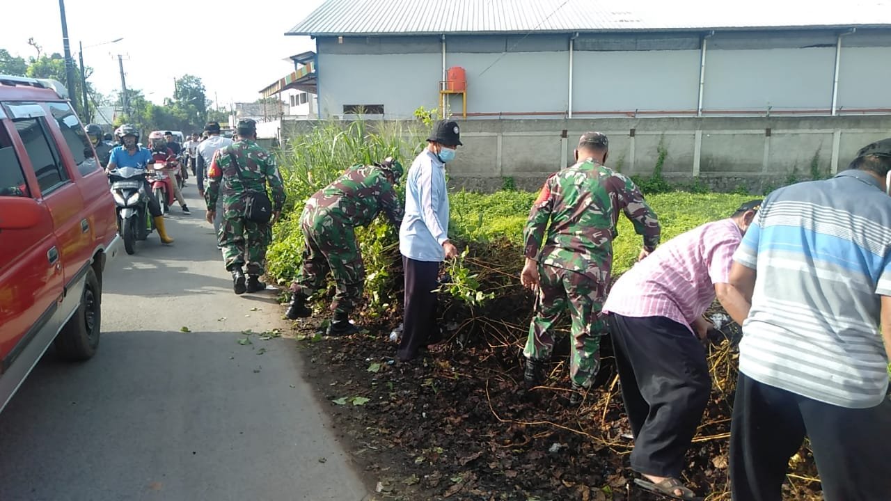 NASIONALXPOS.CO.ID.  Tangerang – Mengantisipasi banjir di musim penghujan, bersama muspika kecamatan Sepatan Timur anggota koramil 10/Sepatan dan warga melakukan serbuan teritorial (serter) berupa katja bakti (karbak) membersihkan sampah di sisi kiri kanan jalan tepatnya di jalan Raya Kedaung Barat desa Kedaung Barat kecamatan Sepatan Timur kabupaten Tangerang, Sabtu (19/12/2020).