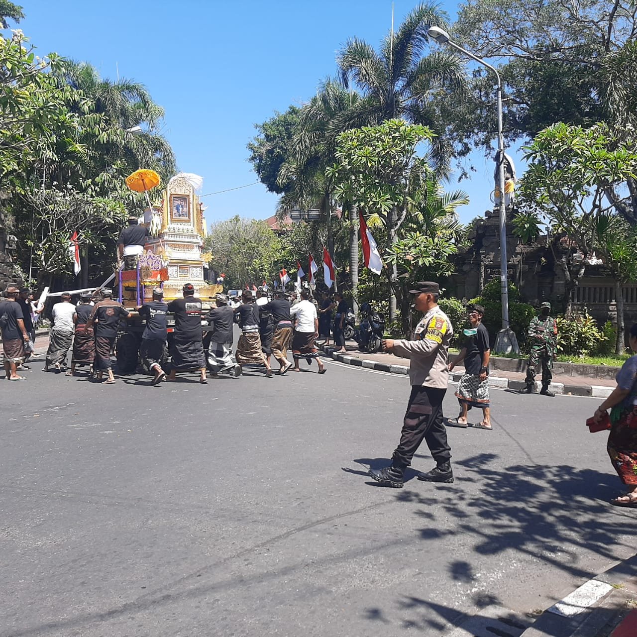 Terlihat Bhabinkamtibmas Kelurahan Kerobokan Kaja Bripka. Gede Eka Pratama S.H., melakukan pengamanan dan kelancaran kegiatan Prosesi Pengabenan Almarhum I Made Dana, 67 Tahun mulai dari rumah duka di Banjar Petingan, Kelurahan Kerobokan Kaja, Kecamatan Kuta Utara, Kabupaten Badung hingga di Setra Desa Adat Kerobokan.