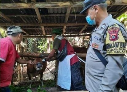 Kapolsek Selat AKP Bambang Haryanto S.H. saat dihubungi mitra humas mengatakan “pendampingan Bhabinkamtibmas dalam pelaksanaan vaksinasi terhadap ternak adalah sebagai upaya bersama dalam mencegah penyebaran PMK pada hewan serta memberikan edukasi kepada petani langkah-langkah pencegahannya,” ucapnya. (PDS Paramananda)