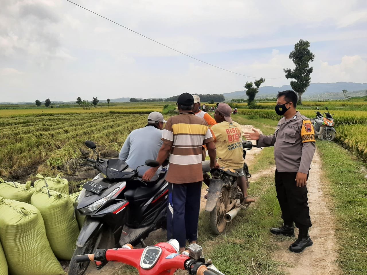 Bhabinkamtibmas Bripka Alif mengimbau warga agar saat beraktifitas disawah hati-hati dan waspada, terutama dalam parkir kendaraan bermotor.