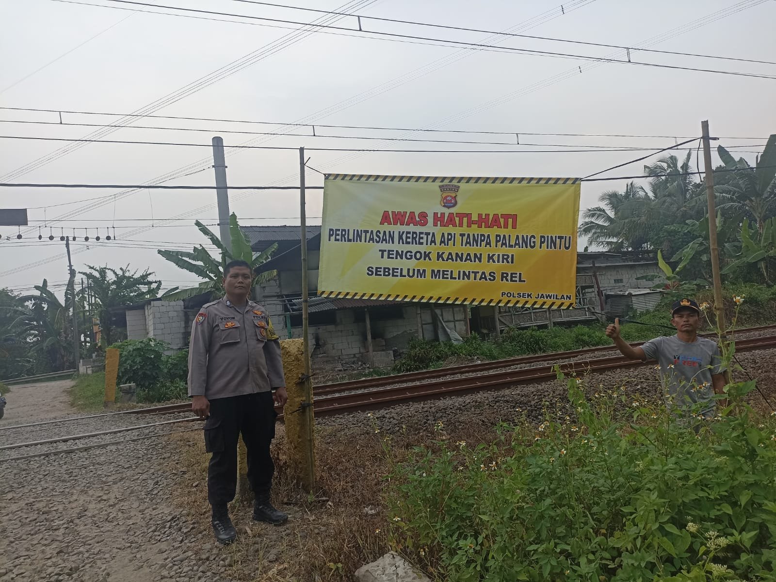 Dalam spanduk yang dipasang itu, bhabinkamtibmas Polsek Jawilan Bripka Yoyon menghimbau agar masyarakat meningkatkan kewaspadaan saat melintasi perlintasan kereta api.