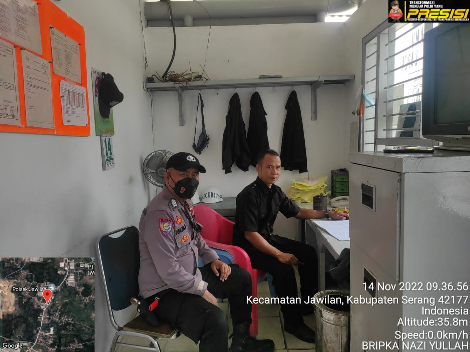 NASIONALXPOS.CO.ID, SERANG – Bhabinkamtibmas Polsek Jawilan Polres Serang BRIPKA Nazi Yullah Melaksanakan kegiatan Sambang perusahaan PT Platinum Desa Majasari kecamatan Jawilan Kabupaten Serang, Senin (15/11/2022).