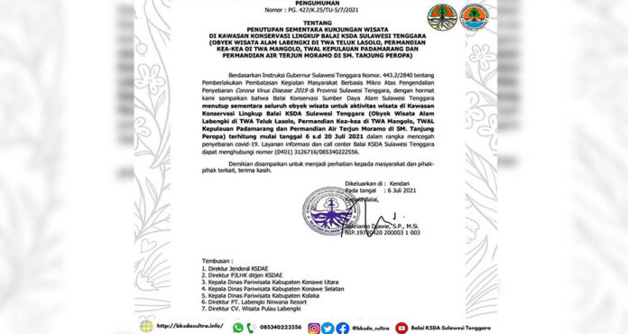 Kepala BKSDA Sultra Sakrianto Djawie mengatakan, penutupan kawasan itu merupakan bentuk dukungan dan komitmen pihaknya terhadap Instruksi Gubernur Sultra Ali Mazi nomor 443.2/2840 tentang PPKM Mikro atas pengendalian penyebaran virus corona (Covid-19).