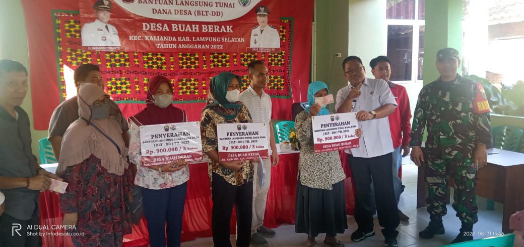 Kegiatan dihadiri langsung Oleh Zaidan SE Camat Kalianda, Andri Ansyah kasi pertanahan Kecamatan Kalianda, Adi Cahyadi Sekdes Buah Bekhak, Marwan, Annes PLD, Fitriansyah PDTI kecamatan Kalianda, Budi katarima PDP kecamatan Kalianda, Abdulrahman SE Ketua BPD Desa Buah Bekhak,Serka Romadiansyah Babinsa Desa Buah Bekhak dan Masyarakat penerima BLT serta seluruh Aparatur Desa Buah Bekhak.