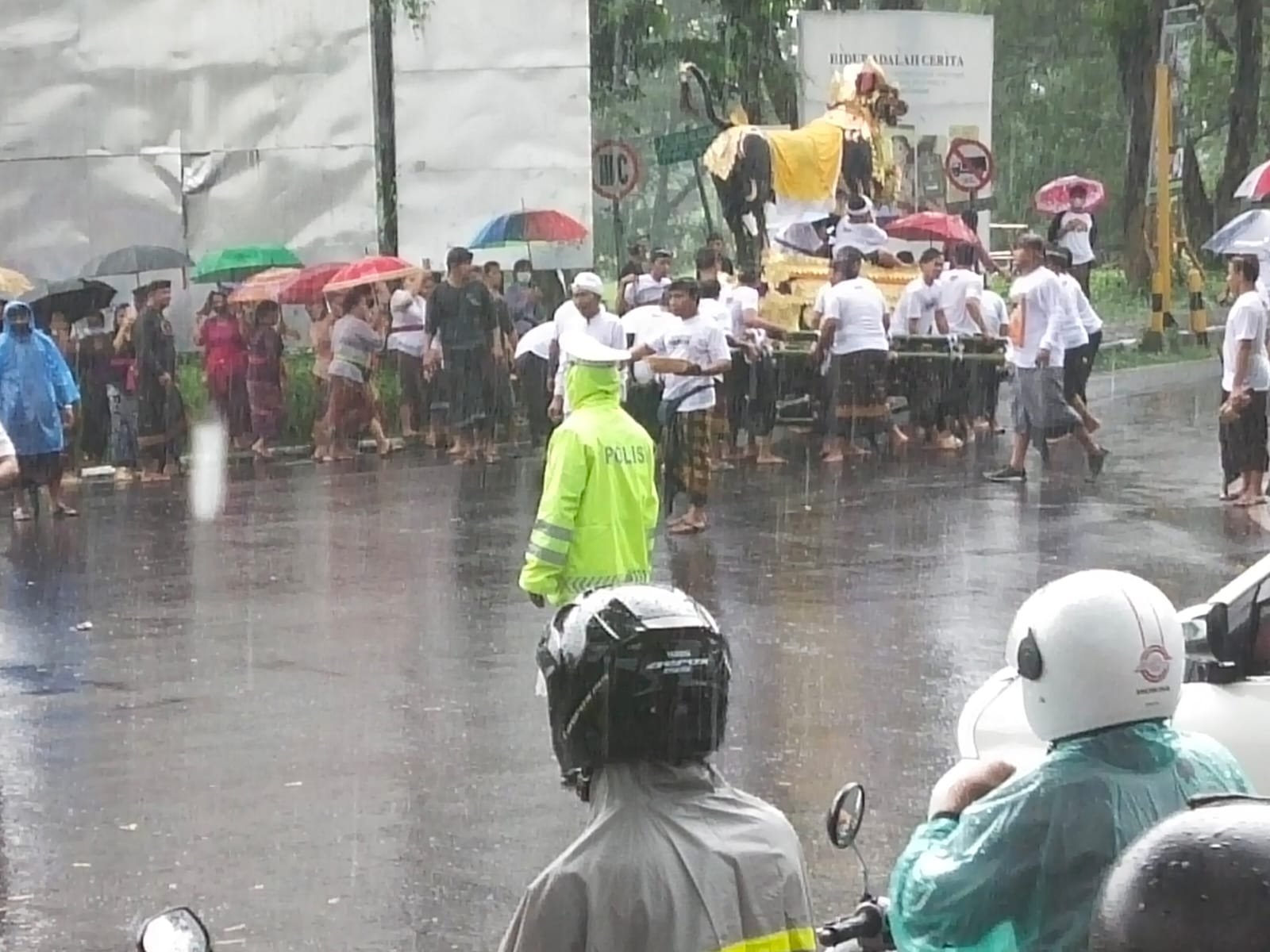 Bermodalkan Jas hujan yang melekat dibadannya, Aiptu. I Wayan Indrayana tetap semangat mengatur Lalu lintas saat warga mengusung Lembu menuju kuburan Beng, Gianyar.