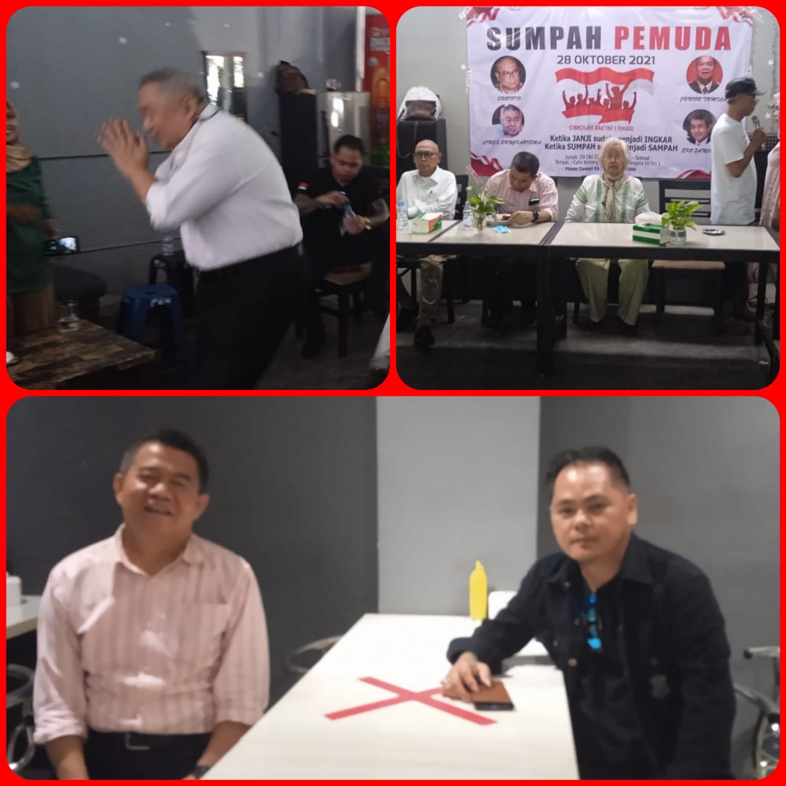 “Saat itu suasana Keakraban untuk memaknai para pejuang pemuda yang mengikrarkan sumpah pemuda dahulu, namun hal yang saya tidak Benar dalam dalam Acara Diskusi peringati Sumpah Pemuda ke-63 sementara di gelar pada saat Brigjen J Tumilaar sebagai narasumber lalu tiba-tiba Seorang peserta diskusi mengangkat poster bertuliskan Jokowi Harus Mundur dan ada beberapa poster lainnya yang diduga bertuliskan kata-kata provokatif dan melecehkan Simbol Negara. Itu sangat menodai simbol persatuan dan kesatuan NKRI apalagi dalam suasana Memaknai dalam memperingati Hari Sumpah Pemuda” Tegas Ante putra Minahasa di perantauan Ibukota.