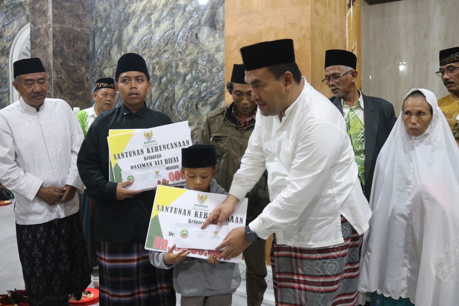 Usai shalat Tarawih berjamaah, Bupati secara langsung menyerahkan santunan kepada Dwi Sofyan Hasim yang merupakan anak pertama dari korban pasangan suami istri Pasiman Ali Rifai dan Maryam, serta santunan diberikan kepada M Arsyil Rohman anak kedua dari korban Sulastri.