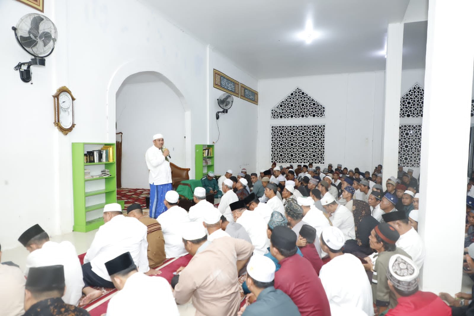Tampak hadir pada kesempatan tersebut, selain Bupati juga ada Staf Ahli Bupati, Asisten, Kepala OPD, para Kabag, Camat, Danramil, Kapolsek, Datuk Rio, Ketua BPD serta para santri Pondok Pesantren Tahfidzul Qur’an Diniyah Salafiyah Al-Fatah.