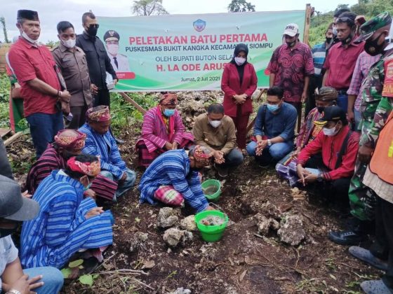 NASIONALXPOS, BUSEL/SULTRA -Bupati Buton Selatan (Busel) H. La Ode Arusani didampingi Ketua Tim Pengerak PKK Kabupaten Buton Selatan Hj. Wa Ode Ruhaniah, meletakkan batu pertama pembangunan Puskesmas Bukit Kangka Desa Karae Kecamatan Siompu, Jumat (02/07/2021).