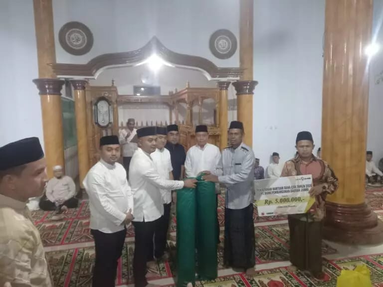 Sebagai bentuk kepedulian, Bupati Tebo menyerahkan bantuan dana pembangunan Masjid Al-Barokah sebesar Rp5.000.000 yang bersumber dari program CSR Bank Jambi.