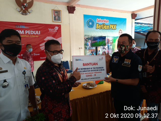 Cilacap- Bertempat di Pendopo Kecamatan Dayeuhluhur Kabupaten Cilacap, PT. Telkom dan Bupati Cilacap Tatto Suwarto Pamuji serahkan bantuan Telkom Peduli ke sejumlah penerima bantuan, Jumat (2/10/2020).