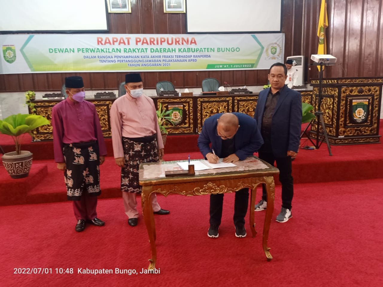 BUNGO, NASIONALXPOS.CO.ID – Bupati Bungo bersama Wakil Bupati Bungo menghadiri Rapat Paripurna DPRD Kabupaten Bungo dalam Rangka Penyampaian Kata Akhir Fraksi Terhadap Ranperda tentang Pertanggungjawaban Pelaksanaan APBD Tahun Anggaran 2021, Jum’at (01/07/2022).