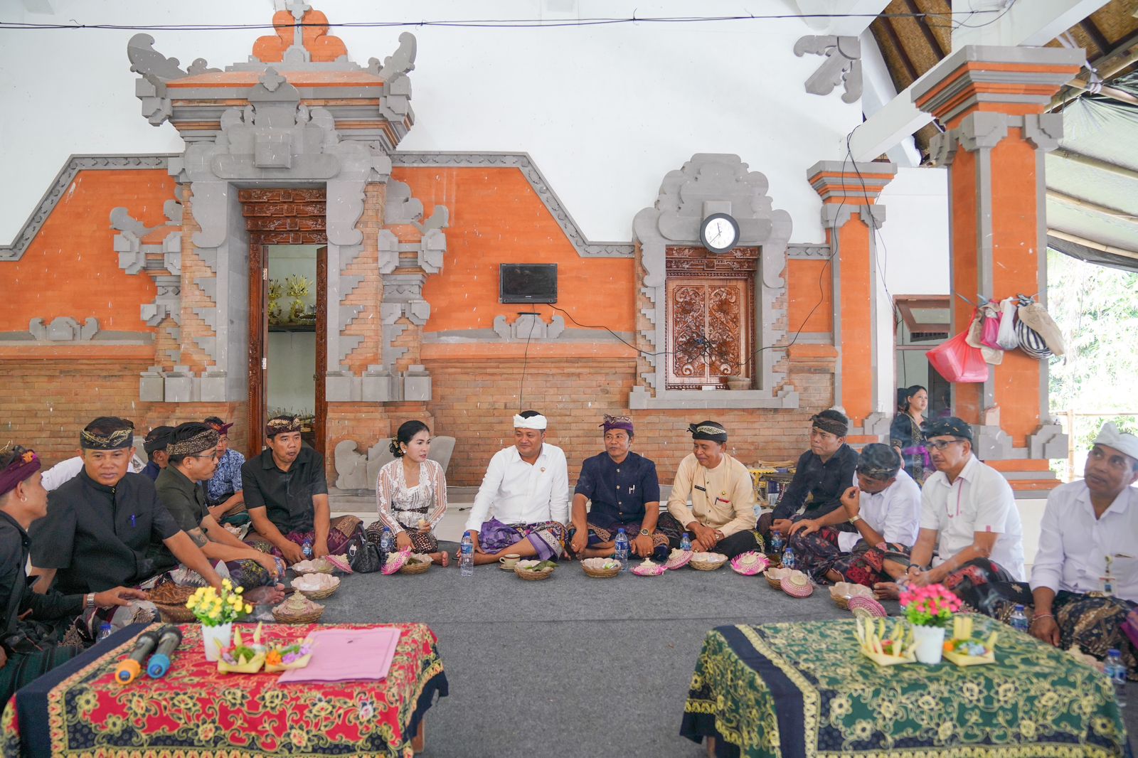 Dalam kesempatan tersebut, Bupati juga menyerahkan bantuan atiwa-tiwa kepada masyarakat diterima secara simbolis oleh prajuru Desa Adat.