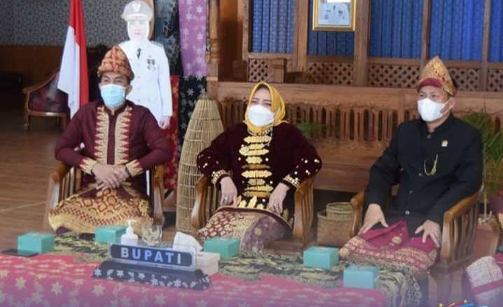 Bupati Musi Rawas Hj Ratna Machmud bersama Ketua DPRD Musi Rawas Azandri, Asisten I, Asisten II dan Asisten III mengikuti secara Virtual di Replika Rumah Adat Kantor Bupati Musi Rawas, Selasa (18/05/2021).