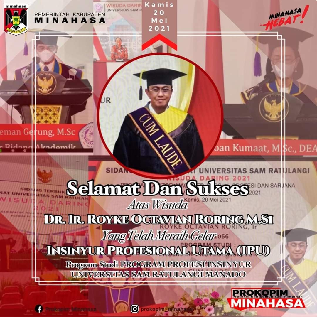 Bupati Royke Roring diwisuda setelah berhasil menyelesaikan studi Program Profesi Insinyur dengan predikat cum laude dan IPK 4,00. Ujian Komprehensif penyelesaian studi ini sudah dilaksanakan pada 10 Juni 2020 dengan Penguji, Dr. Ir. Audie Rumayar, M.Eng. IPU.ASEAN.Eng, Ir. Samuel Rompis, ST.MT, M.Eng, PhD, Prof. Dr. Ir. Hieryco Manalip, M.Sc, DEA dan Prof. Dr. Ir. Markus Lasut, MSc.