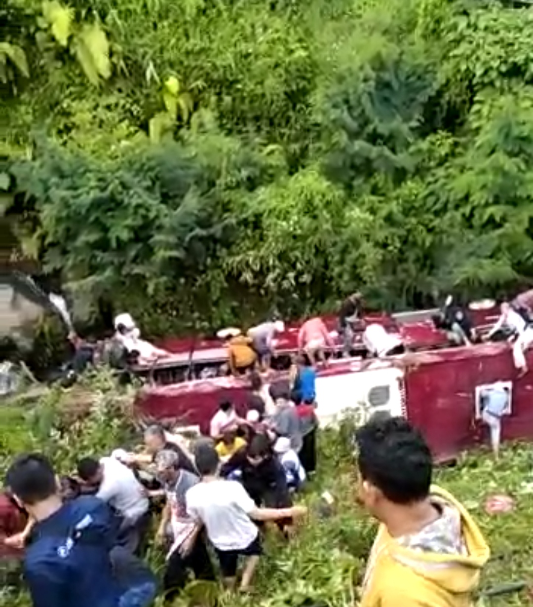 NASIONALXPOS.CO.ID,TEGAL – Sebuah bus besar berwarna merah terguling dan terjun ke jurang di jalur Objek Wisata Guci, Kabupaten Tegal, Jawa Tengah, Minggu (7/5/2023).