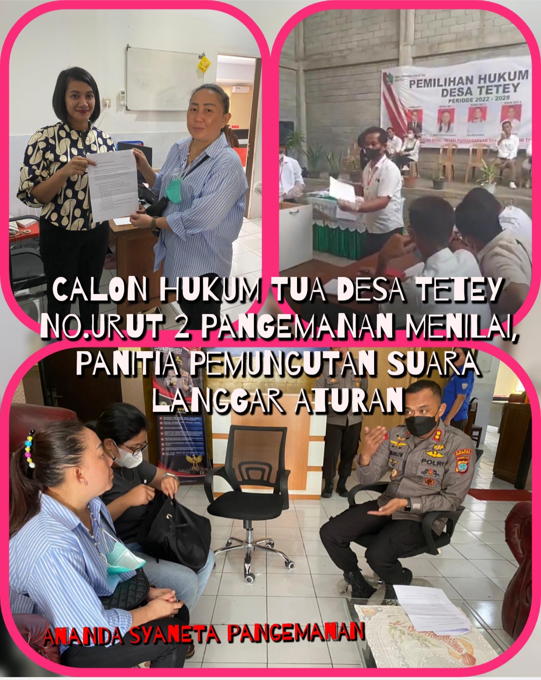 Ananda syaneta pangemanan menjelaskan gugatannya sebagai berikut 1 .tidak dilakukannya proses registrasi saat pemungutan suara dilaksanakan ( lihat perbub ). 2. Jumlah pemilih suara sah TPS 1. 465 suara sedangkan kerusakan surat suara sebanyak 151( surat suara Tidak sah) atau mencapai 32 persen dari jumlah pemilih.