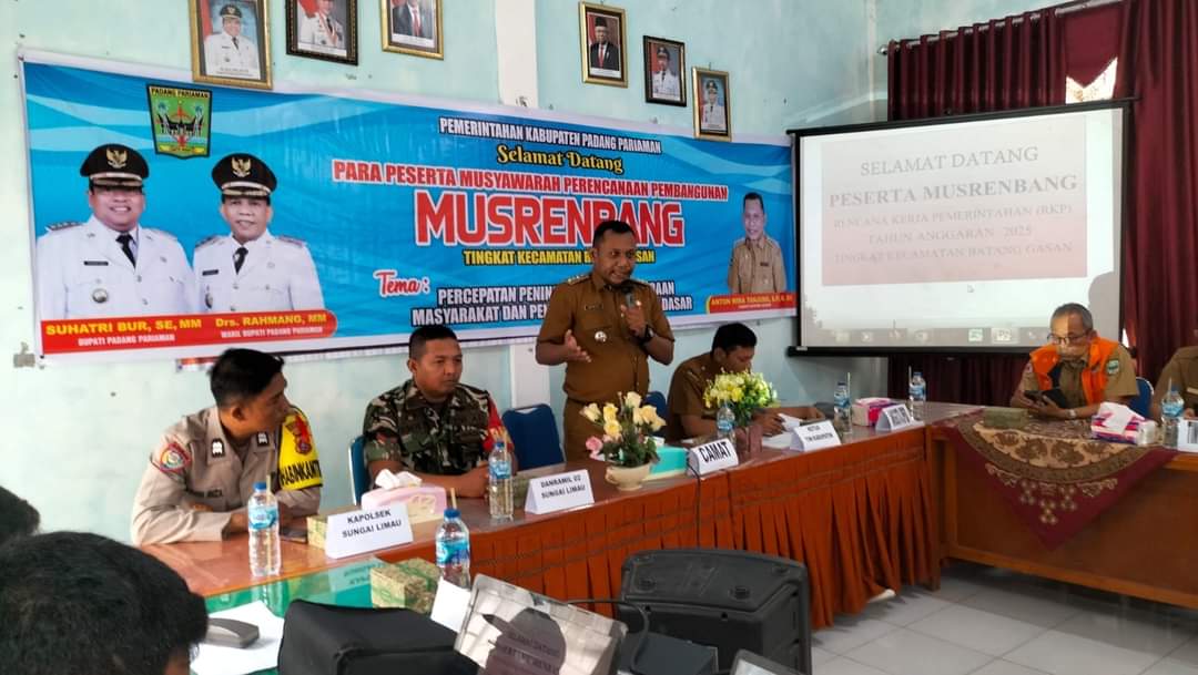 NASIONALXPOS.CO.ID, PADANG PARIAMAN – Camat Batang Gasan Kabupaten Padang Pariaman menggelar Musrenbang kecamatan dan sekaligus menyusun Rencana Kerja Pemerintah Daerah (RKPD) tahun 2025, dengan memprioritaskan pembangunan insfratruktur ekonomi, pencegahan Stunting, meningkatkan sektor pariwisata dan juga meningkatkan ketahanan pangan bertempat di aula kantor camat Batang Gasan, kabupaten Padang Pariaman, Sumbar, Senin (19 /2/24).