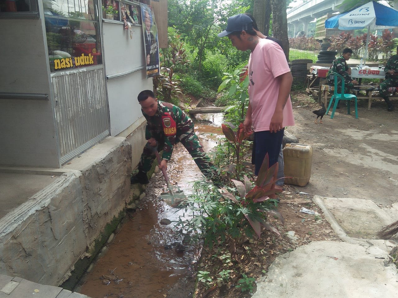 NASIONALXPOS.CO.ID, PALEMBANG – Babinsa Kelurahan Tangga Takat Koramil 418-03/Plaju Serka Martin, membantu warga Bapak Suhaimi membersihkan saluran air/parit, Sabtu (27/5/2023).