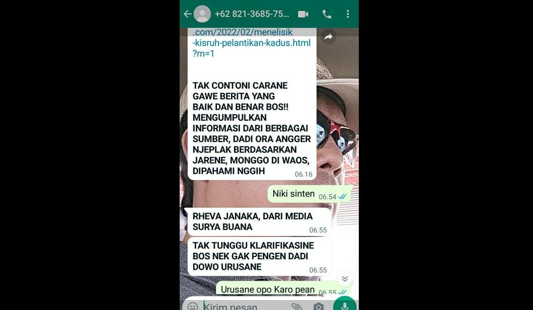 “RHEVA JANAKA, DARI MEDIA SURYA BUANA, TAK TUNGGU KLARIFIKASINE BOS NEK GAK PENGEN DADI DOWO URUSANE,” tulis akun WhatsApp tersebut mengintimidasi pekerja pers yang dilindungi UU Pers Nomor 40 tahun 1999.